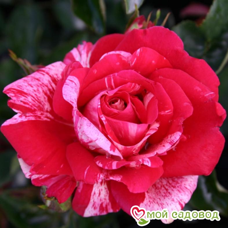 Чайно-гибридная роза с бутонами классической формы, которые раскрываются в крупные махровые малиново-красные цветки с белыми полосками, причем расположение этих полосок уникально для каждого цветка. Аромата практически нет. Цветение повторное. Куст крепкий, компактный, высотой около метра или чуть больше, компактный, со светло-зеленой листвой, устойчивой к заболеваниям.